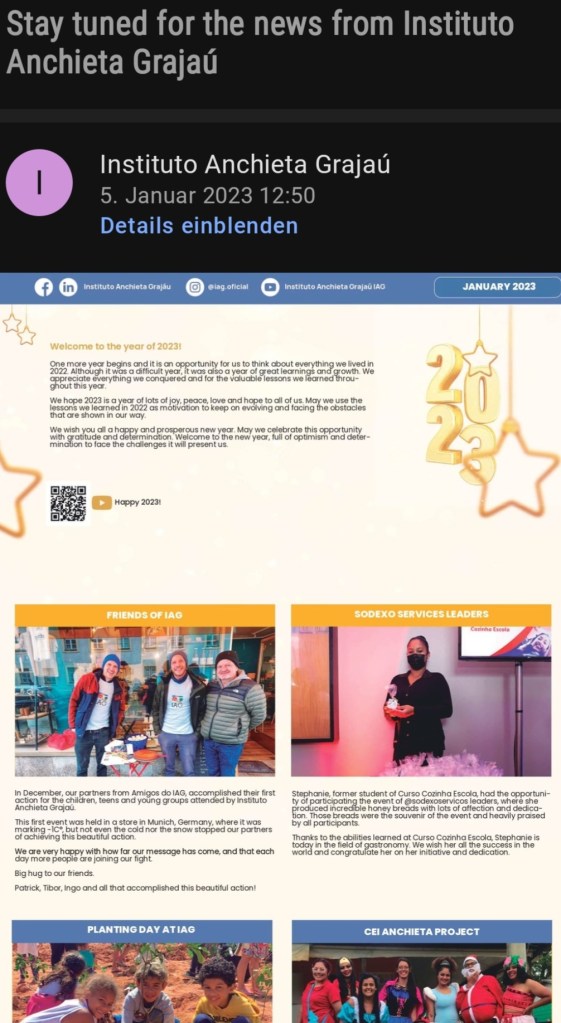 Das Instituto Anchieta Grajaú bietet ab sofort einen monatlichen E-Mail-Newsletter in englischer Sprache. Ideal für alle Interessierten, die mehr über die wichtige Arbeit zur Schaffung von Bildung und Chancen in São Paulo erfahren möchten.